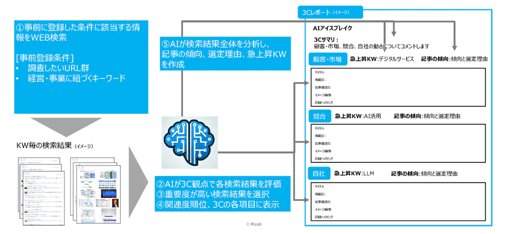 従来、27ものサイトをスタッフが検索して3C(※)の観点から重要と思われる情報を探し出し、影響分析を加えた市場レポートを月1回作成していました。しかし1回のレポート作成に約17時間/月の工数がかかっていたこともあり、月1回の配信にとどまっていました。