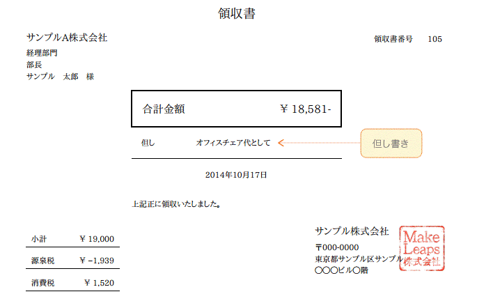 領収書のフォーマットによって多少異なりますが、但し書きは以下のように表記されます。