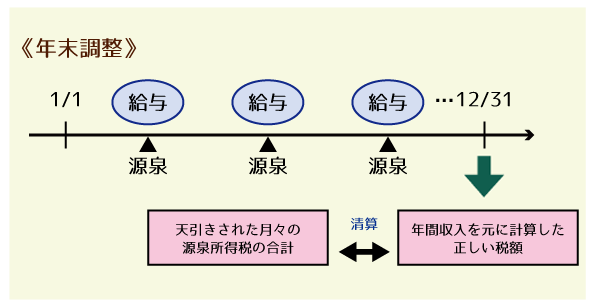 このときに正しい税金の計算はたくさんの個人情報が必要なので、いったん見積もりの税金で月々の給料から集めておき、年末に正しい税金を算定して差額の精算を行います。
