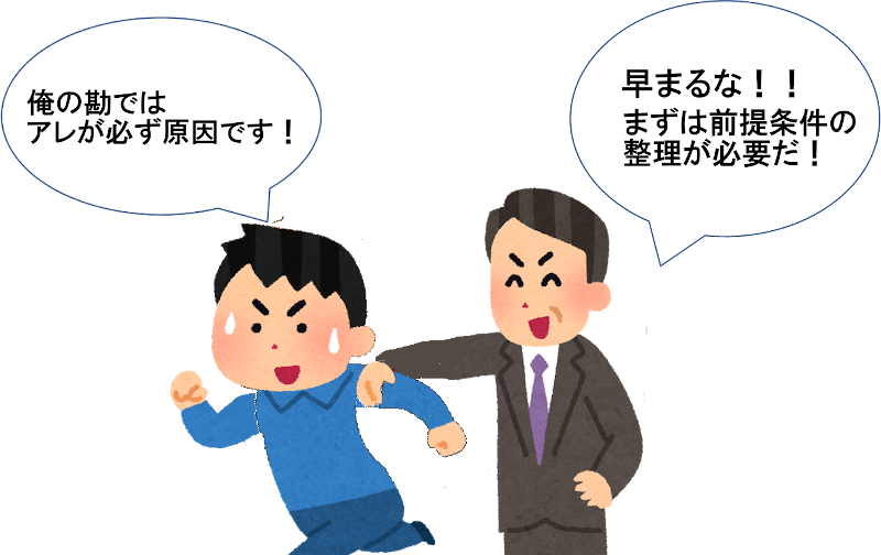 テレビドラマの刑事たちは、事件が発生した現場において、金品は奪われていなかった、着衣に乱れはなかった、といった事実を、犯人を割り出すための前提として整理した上で、犯人を絞り込んでいる。同じように、どんな事故でも不良でも失敗でも、原因を探っていく際には、前提条件を整理した上で、原因を絞り込んでいくことが肝心だ。実際、失敗した担当者は新人なのか、ベテランなのか、いつもと同じ状況で失敗したのか、何か特別な事情があったのか、めったにないパターンの入力で失敗したのか、といったことが、原因を探る上での大前提になる。