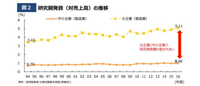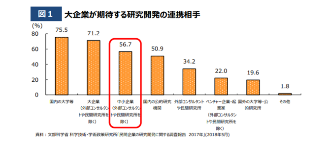 小回りの効く中小企業は、大企業からも研究開発の連携相手として期待されています。大企業との連携を含め、中小企業の研究開発への取組を促進することが必要と言えます。